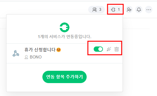 - 연동 서비스 프로필 설정 : 메시지 발송 웹훅임을 구분하기 위해 Webhook의 이름을 변경해 주세요 (*예시 휴가알리미)