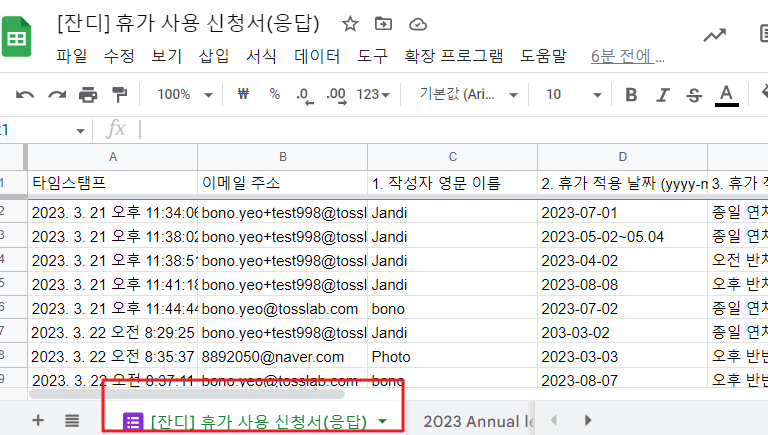 2. 연차 관리를 위한 응답 스프레드시트 확인하기