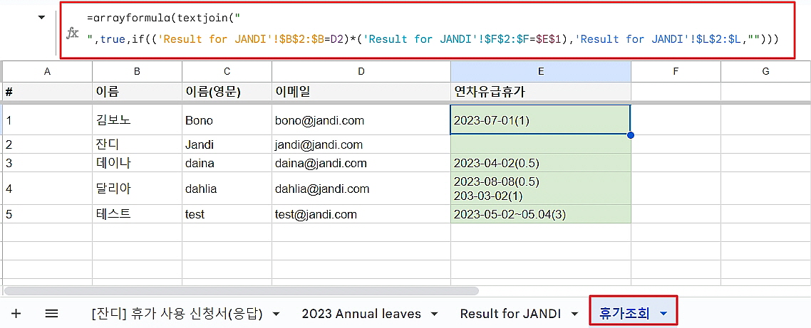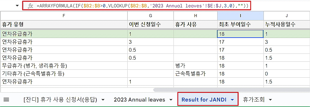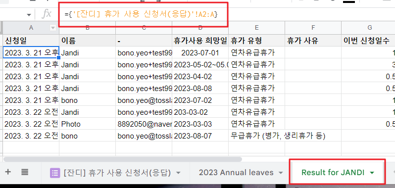 - 멤버들이 신청한 연차가 시트에 등록되면, 3-1에서 만들었던 ‘[잔디] 휴가 사용 신청서(응답)’과 2023 Annual leaves에서 수식을 사용해서 연차 정보를 가져올게요!