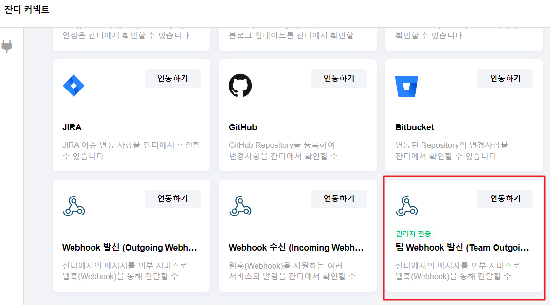 1-2. 잔디 커넥트 항목 중 하단에 있는 [Webhook 수신 (Incoming Webhook)] 의 [연동 항목 추가하기] 버튼을 클릭해 주세요.