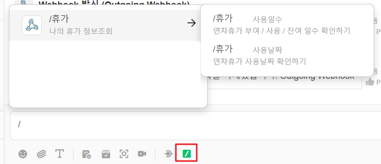 - JANDI (나와의 대화) 메시지 입력창에 메시지 입력창에 ‘/(커맨드) + 키워드 입력’ 혹은 ‘/(커맨드) 아이콘 클릭’ 으로 웹훅을 실행해주세요.