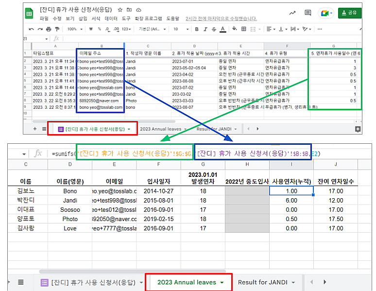 =sumifs(‘[잔디] 휴가 사용 신청서(응답)’!$G:$G,‘[잔디] 휴가 사용 신청서(응답)’!$B:$B,E2)