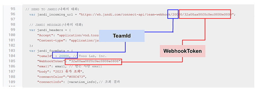 - 코드 내용 중, 위 표시된 부분 중 Team incoming Webhook을 위해 TeamId와 WebhookToken 두 개의 정보가 필요해요!