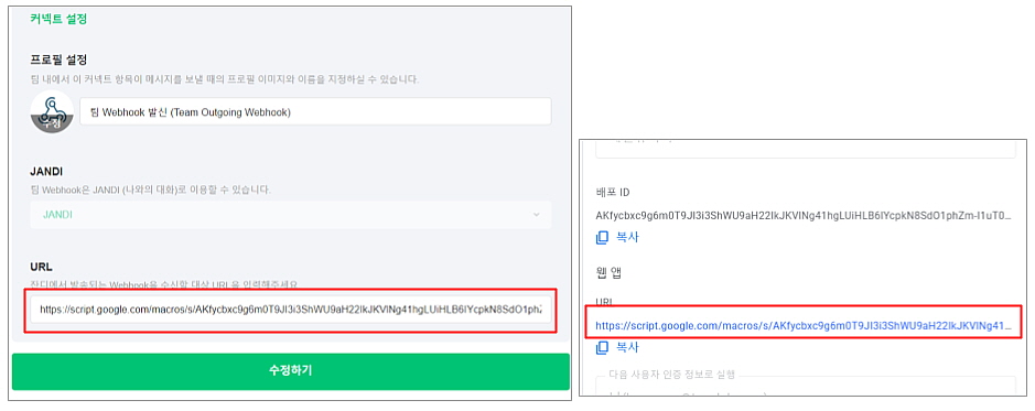 배포 후 생성된 웹앱 URL은 복사해두세요. (*복사된 URL은 Outgoing webhook URL로 사용됩니다)