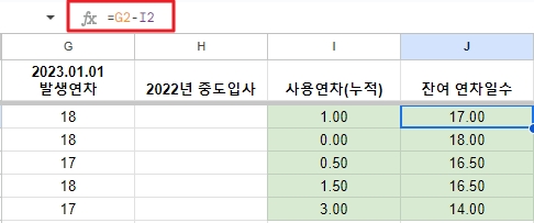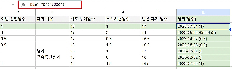 [최초 부여일수, 누적 사용일, 남은 휴가일수 수식]