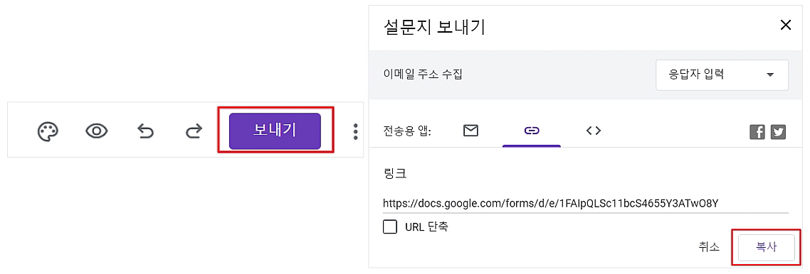 1-4. [보내기]를 통해서 만들었던 설문지를 공유할 수 있습니다.
