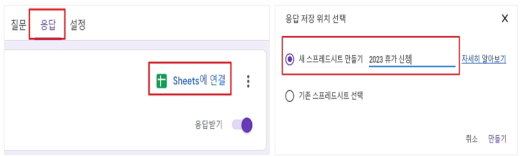 1-2. 휴가 신청서 항목들이 완성되었다면, [응답] 시트를 생성해요.