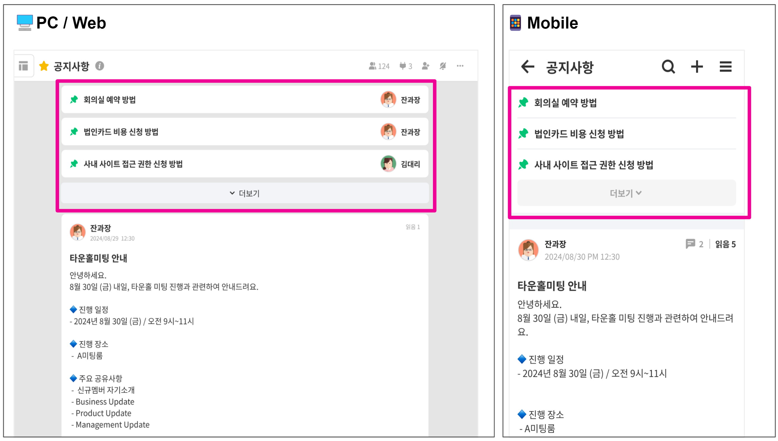 - 게시글(Post)을 고정 형태로 확인할 수 있는 대화방입니다.
