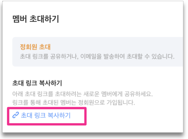 한 번에 많은 멤버를 간단하게 초대하고 싶은 경우에는 초대 링크를 복사해서 메신저나 메일로 공유해 주세요.