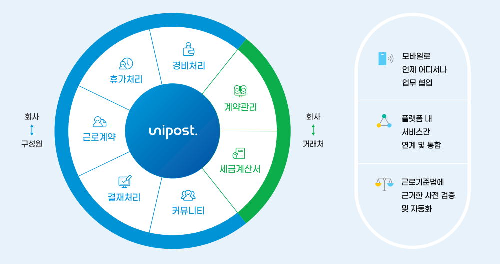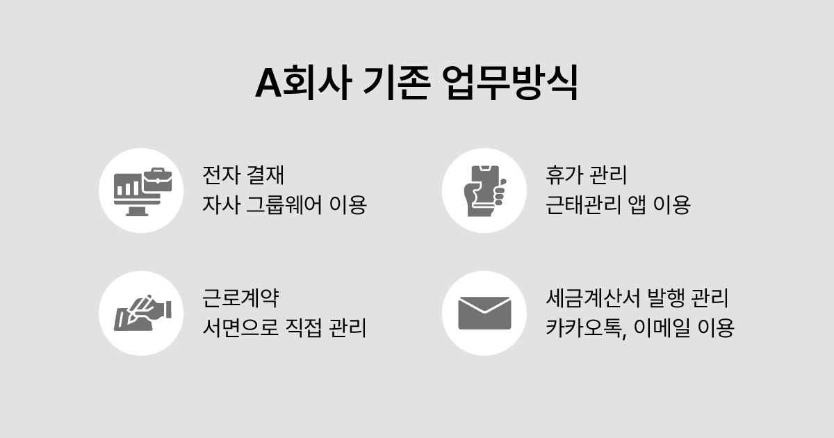 전자결재, 경비처리, 휴가처리, 계약관리, 세금계산서와 같은