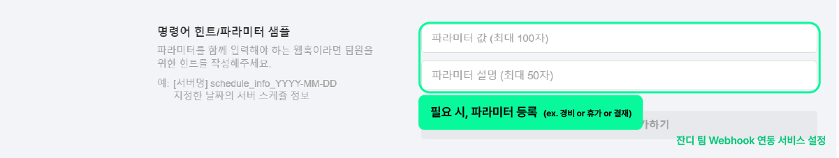 - 파라미터 설명에는 팀원들을 위해 ‘이 웹훅을 어떻게 사용하는 것인지’에 대해 간단한 설명을 적어주시면 됩니다.