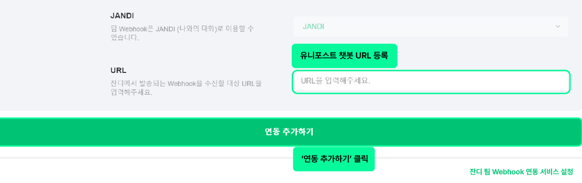 7. 다시 잔디 팀 Webhook 연동 화면으로 돌아와서, URL 항목에 복사한 유니포스트 챗봇 URL을 붙여넣어 주세요.
