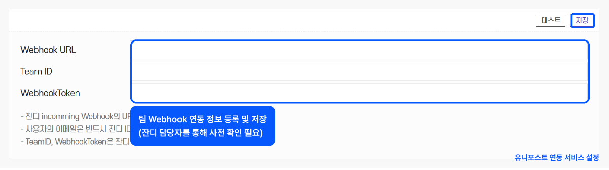 Team ID는 각 팀이 가지고 있는 고유한 아이디로, 잔디 유료 서비스 이용 시 발급됩니다. 유니포스트에서 전달받은 Team ID, Webhook URL, WebhookToken을 입력해 주시고 ‘저장’ 버튼을 눌러주세요.