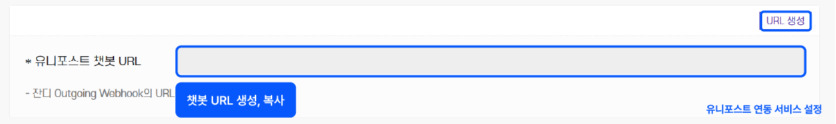6. 유니포스트 챗봇 URL을 생성하기 위해 우측 ‘URL 생성’을 누르고, URL을 생성해주세요. 그 후 해당 URL을 복사해주세요.