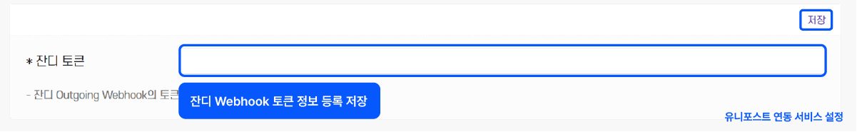 5. 유니포스트 연동 화면으로 돌아가서 방금 복사한 토큰을 ‘잔디 토큰’에 붙여넣고 저장 버튼을 눌러주세요.