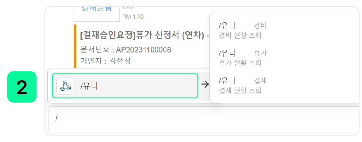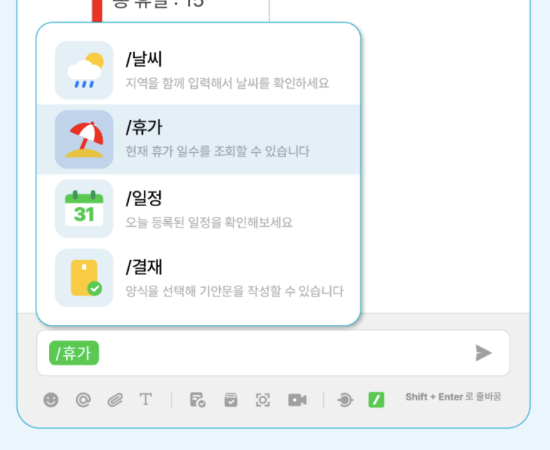 - ‘유니’ 대신 휴가라는 단어를 시작 키워드로 사용하시면 아래와 같이 메시지 입력창에 표시됩니다. 메시지 입력란에 ‘/휴가’를 입력하면 아래와 같이 시작 키워드가 노출됩니다.
