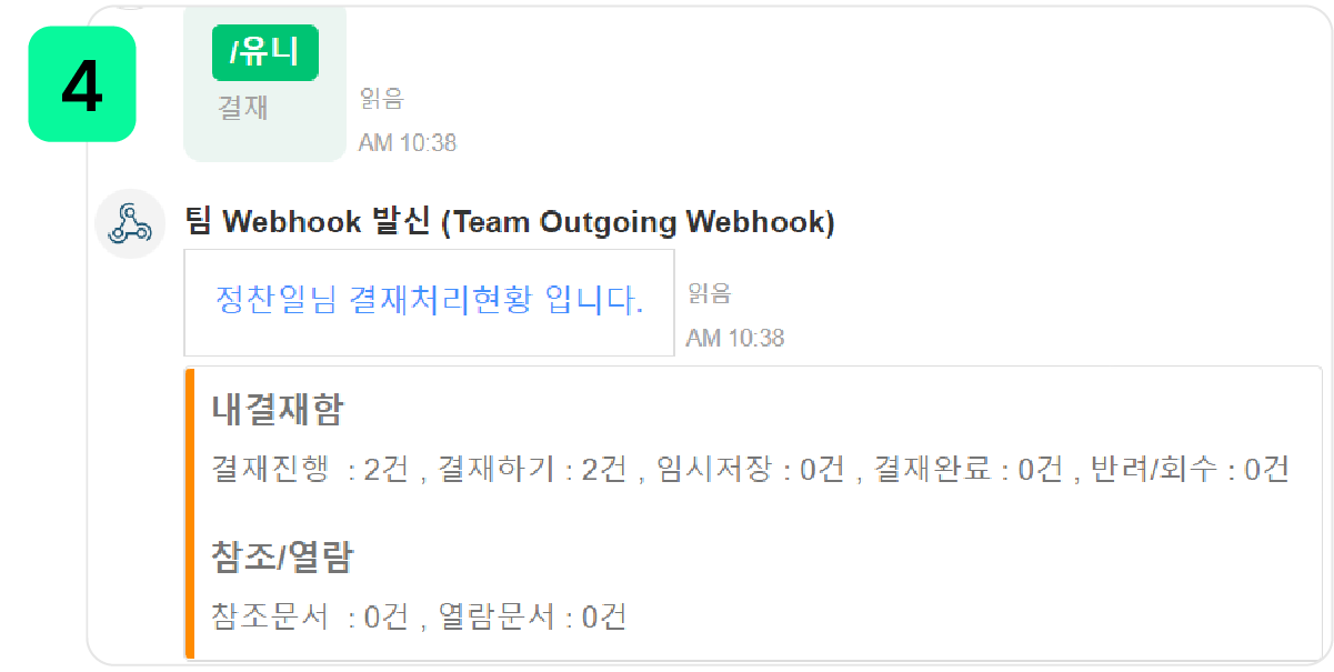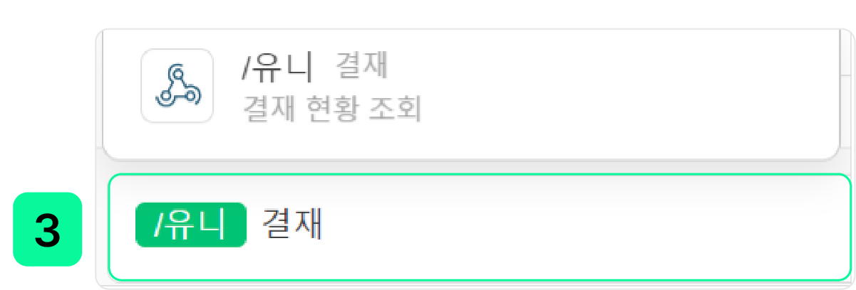 4. 이렇게 유니포스트 전자결재 현황이 잘 조회되면 연동 성공입니다. 앞으로 채팅창에 ‘/유니’를 입력해서 전자결재 현황을 확인하시면 됩니다 😉