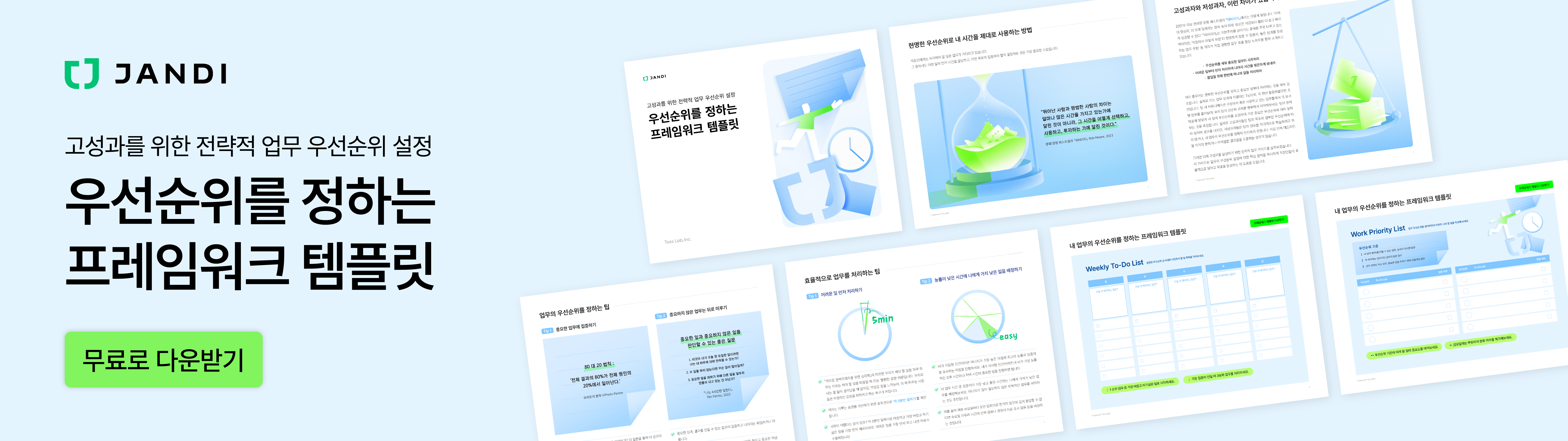 ‘할 일은 많은데 시간은 왜 이렇게 빠를까?’라는 고민은 누구나 한 번쯤 했을 법합니다. 명확한 우선순위 없이 여러 가지 일을 처리하다 보면 중요한 업무에 깊게 집중하지 못하고 시간만 빨리 지나가게 되는데요. 8시간의 근무 시간 안에서 고성과를 내려면 전략적으로 업무를 처리하는 것이 중요합니다. 업무 우선순위 설정 Tip과 시간을 효과적으로 활용하는 방법까지 <우선순위를 정하는 프레임워크 템플릿>에서 확인하고 프레임워크 템플릿을 무료로 받아가세요.