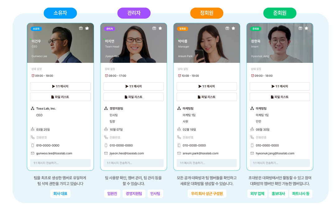 - 관리자: 멤버, 팀 설정을 하는 사람이며 보통 조직의 임원, 경영 직원, 인사팀에 근무하는 멤버가 담당해요.
