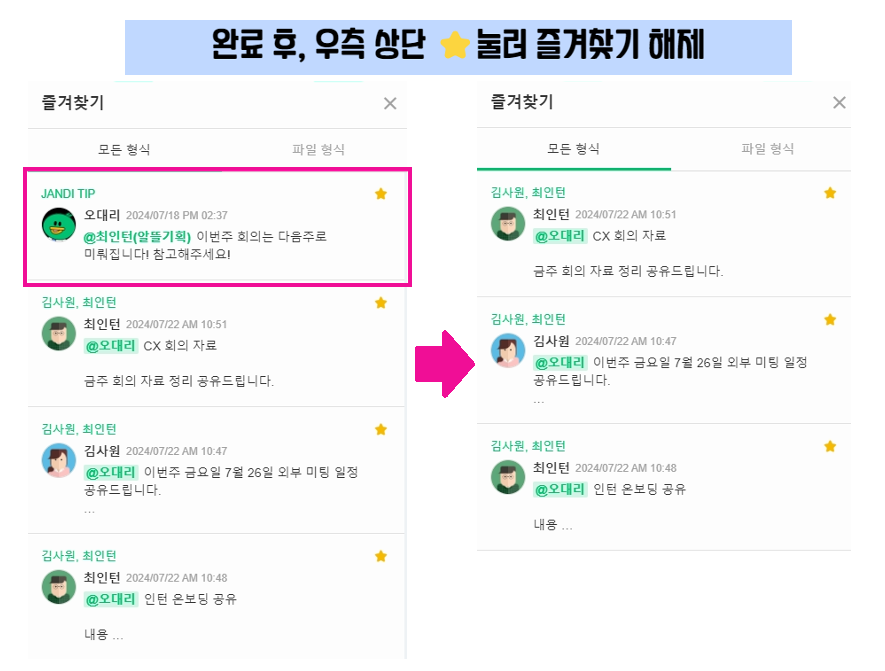 그럼 멘션 된 메시지를 즐겨찾기 해둔 후, To do list처럼 활용해 보세요!