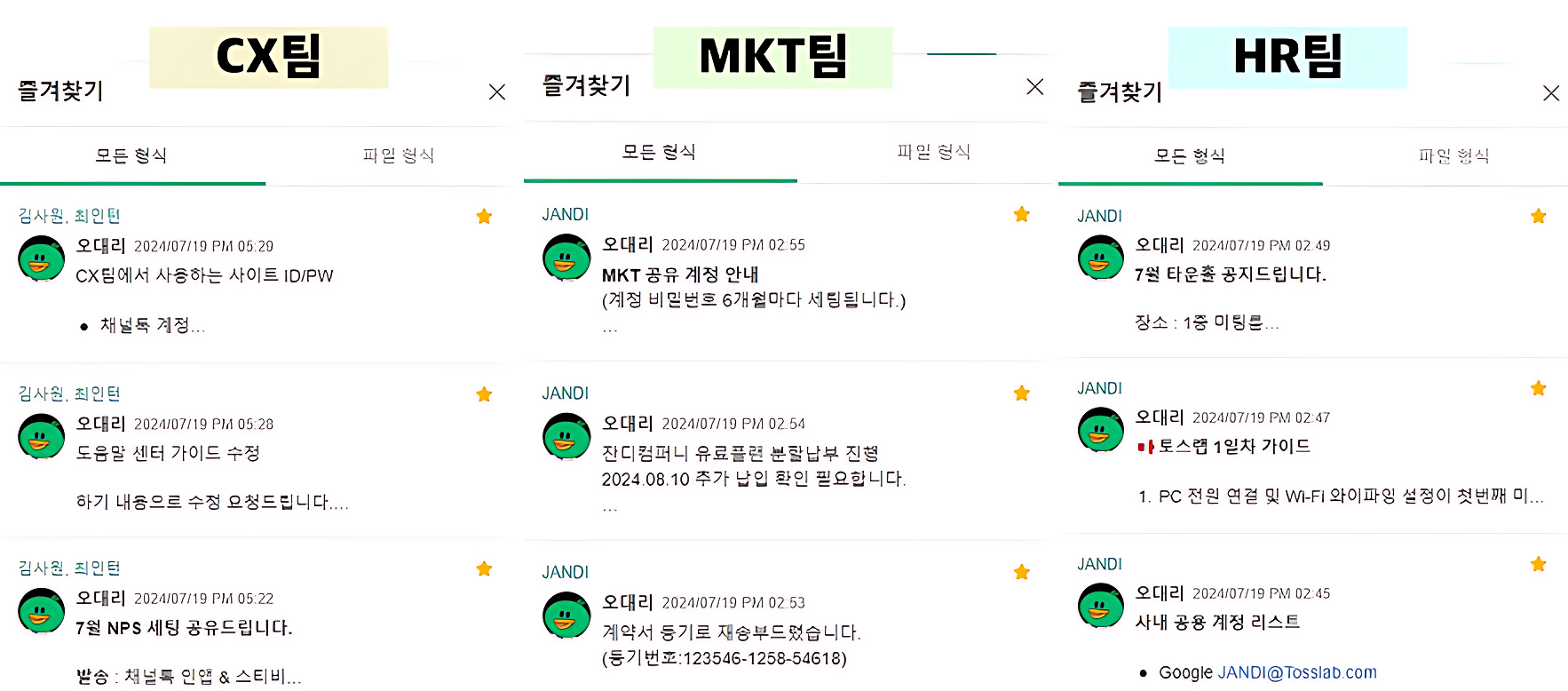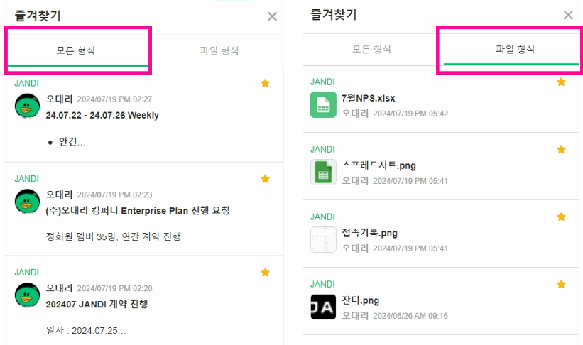 즐겨찾기는 팀마다 개인마다 다양하게 활용할 수 있어서 더 매력적인 기능이랍니다.