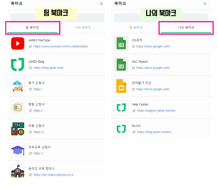 나의 북마크는 다른 구성원에게는 보이지 않는 나만의 비공개 북마크 입니다.