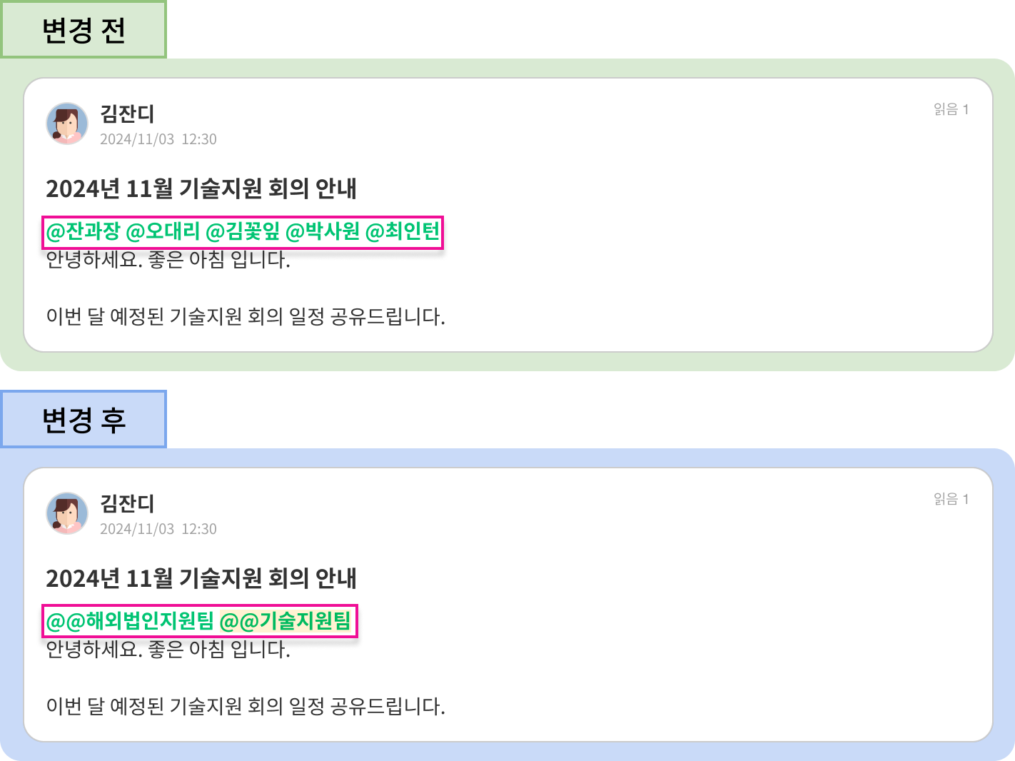 이번 업데이트 소식에서는 새로 추가된 조직 멘션 기능을 소개해 드리겠습니다.