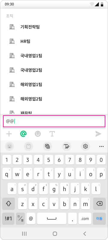 - 메시지 입력창 하단의 멘션(@)을 클릭 후, 조직을 클릭해도 동일하게 작동합니다.