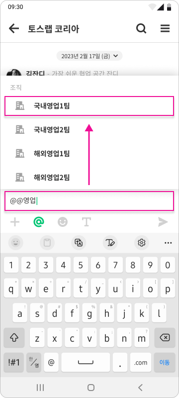 2. 조직명을 입력하거나, 조직 멘션 리스트를 스크롤하여 멘션할 조직을 선택합니다.
