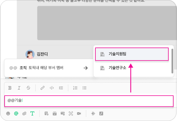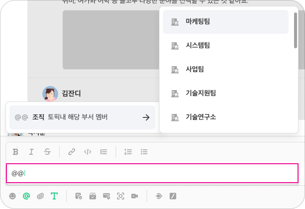 1. 메시지 입력창에 @를 입력하여 멘션 기능을 열고, @를 한 번 더 입력하여 조직 멘션 기능을 엽니다.