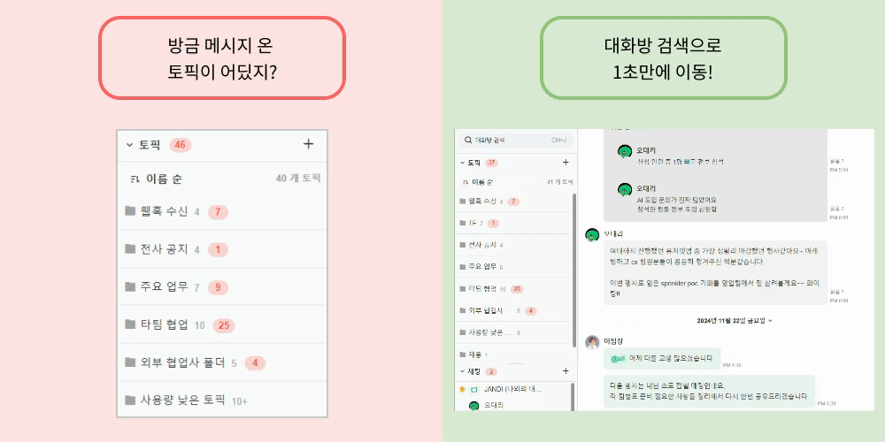 대화방 검색 기능은 참여한 대화방(토픽, 채팅)이 많을수록 꼭 필요한 기능입니다!