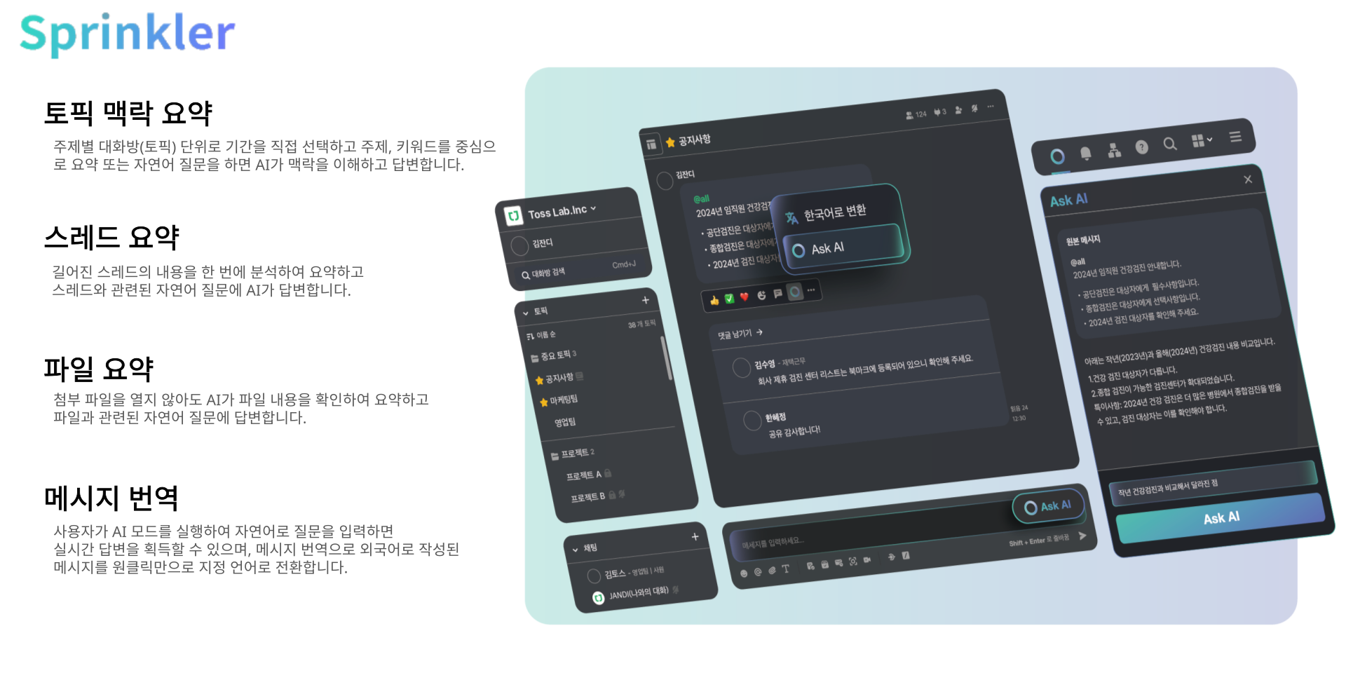 무궁무진한 가능성을 가진 잔디 AI 스프링클러가 곧 공개됩니다. 토픽, 메시지, 파일 요약부터 실시간 번역 등 다양한 기능이 가득 담겨 여러분께 소개될 예정입니다.
