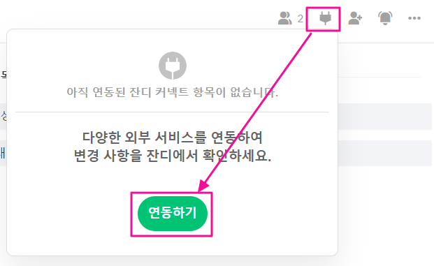 1-1) 반복 메시지를 발송할 토픽을 선택 후, 우측 상단 플러그 모양 [잔디 커넥트] – [연동하기]를 클릭해 주세요.