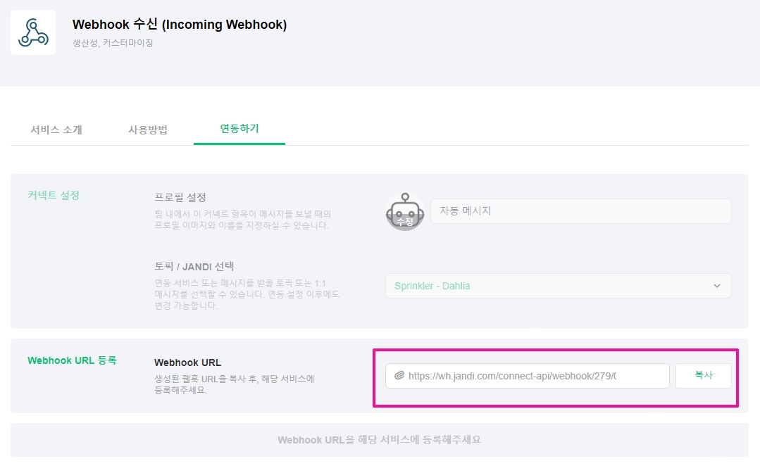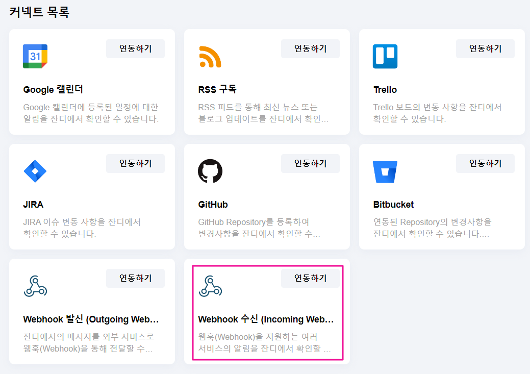 1-2) [Webhook 수신 (Incoming Webhook)]의 [연동하기] 버튼을 클릭해 주세요.