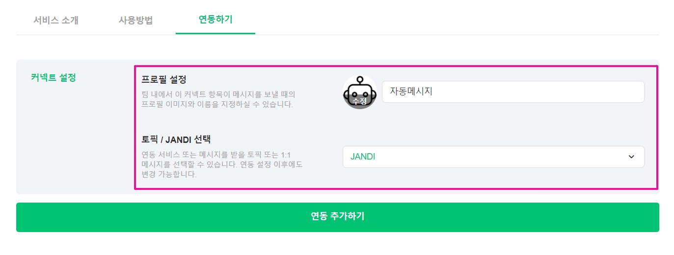 1-3) 웹훅 세부 사항을 설정한 후에 [연동 추가하기] 버튼을 클릭해 주세요.