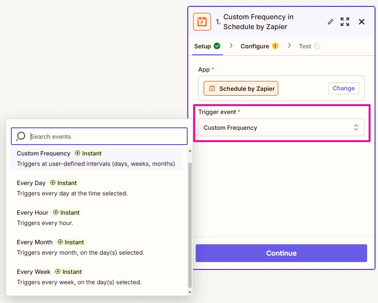 2-3) Trigger event에서 받고 싶은 주기를 선택해 주시고, [To Continue, choose an event] 클릭해 주세요.