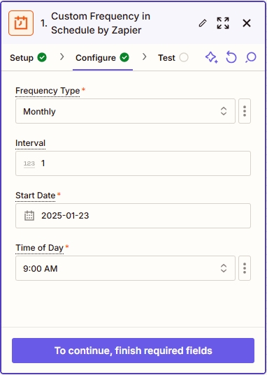 *예시 이미지는 2-3에서 Custom Frequency 클릭 후 매월 1일 9:00 AM에 반복 메시지를 보낼 수 있도록 설정했습니다.. Start Date에는 시작 일을 입력해 주세요.