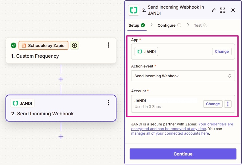 2-6) Action에서 JANDI 앱 선택 및 Event에서 [Send Incoming Webhook] – [Account]에서 계정 연결 후 [Continue] 클릭해 주세요.