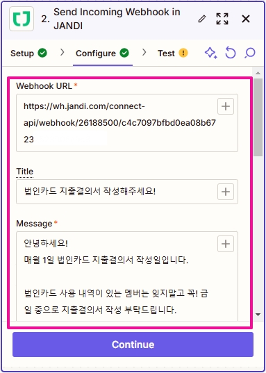 2-7) [Webhook URL] 내 1-4에서 복사한 Webhook URL를 붙여넣기 및 Title과 Message 내 반복 될 메시지를 입력 후 [Continue]를 클릭해 주세요.