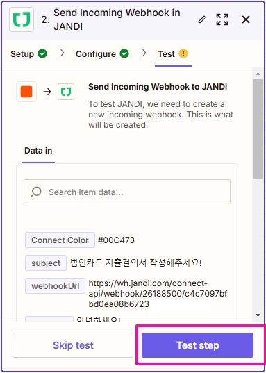 2-8) [Test step] 클릭하여 정상적으로 잔디 메시지가 들어오는지 테스트를 진행해 주세요.