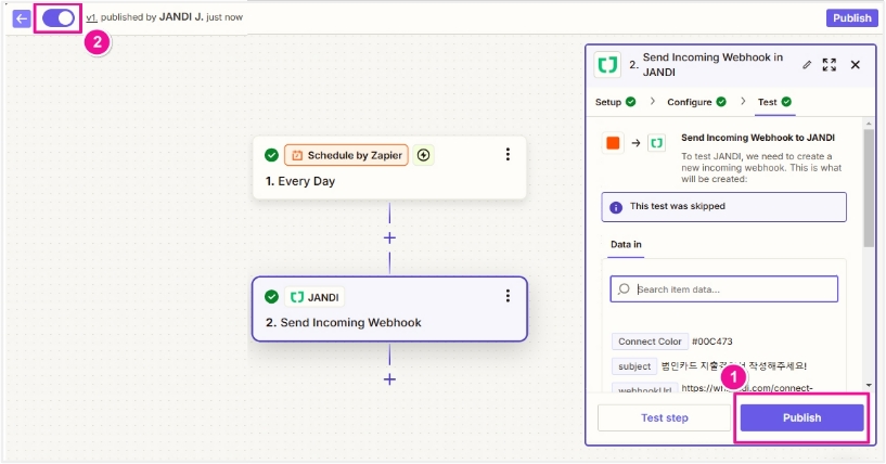 2-9) 테스트 알림이 잘 온다면, [Publish] 클릭 후 Zap 상단 화면에서 [ON]으로 켜져 있는지 확인해주세요.