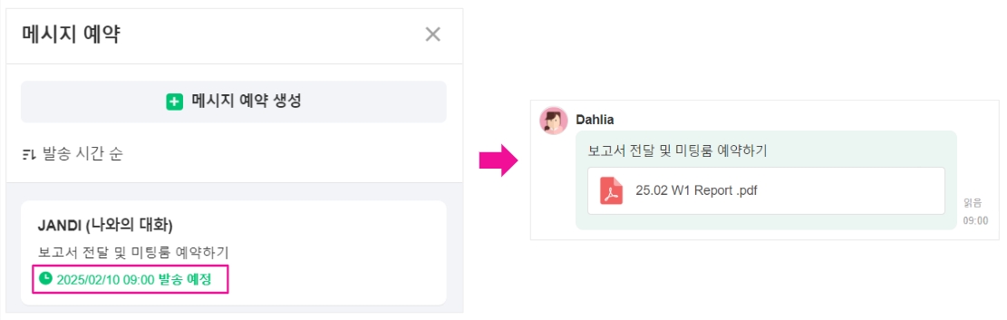 메시지 예약 리스트를 확인 및 관리할 수 있으며, 설정한 일정 시간에 자동으로 대화방에 메시지가 발송됩니다.
