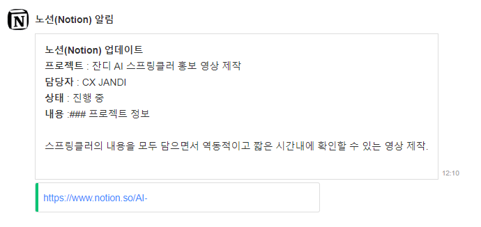 이제 노션 데이터베이스에서 업데이트되는 내용을 잔디에 연동된 대화방에서 알림으로 받아볼 수 있습니다.