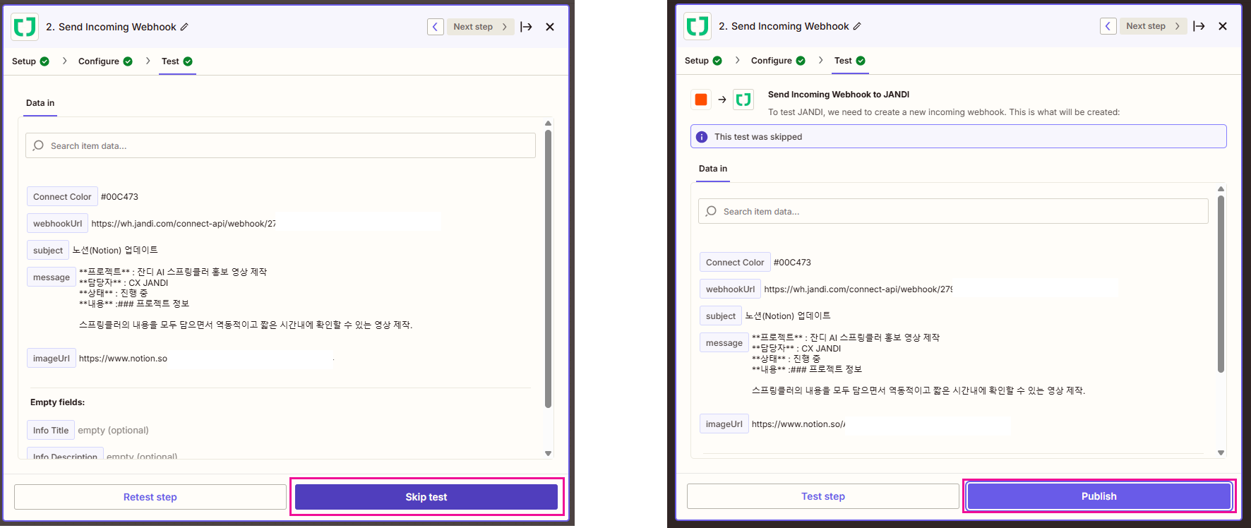 3-5) 토픽으로 테스트 알림이 잘 오면 [Skip test]를 누른 후, [Publish] 버튼을 눌러 Zap을 실행합니다.