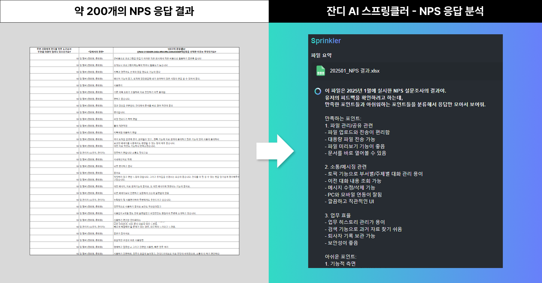- 스프링클러 사용 후: [잔디 AI 스프링클러 – 파일 요약]을 통해 응답을 한 번에 분류하고, 핵심 내용들을 쉽게 모아볼 수 있게 되었습니다!