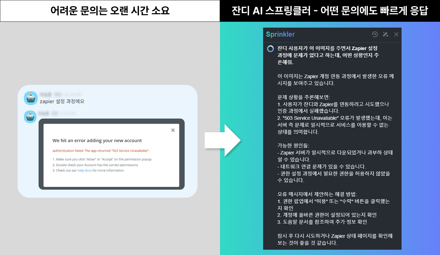 - 스프링클러 사용 후: [잔디 AI 스프링클러 – Ask AI]기능 덕분에 모든 문의에 신속하게 대응할 수 있게 되었습니다. 각 문의에 대해 여러 가지 예상 원인과 해결책을 제시해 주어, 생소한 질문에도 빠르게 답변할 수 있어 사용자 만족도가 크게 향상되었습니다.
