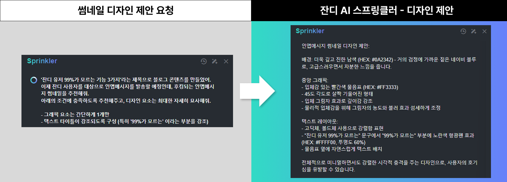 - 스프링클러 사용 후: [잔디 AI 스프링클러 – Ask AI] 기능으로 다양한 썸네일 디자인 아이디어를 얻어 실제 작업에 적용하고 있어요! ‘잔디 유저 99%가 모르는 3가지 기능’ 콘텐츠의 썸네일은 스프링클러의 기획으로 탄생했습니다!