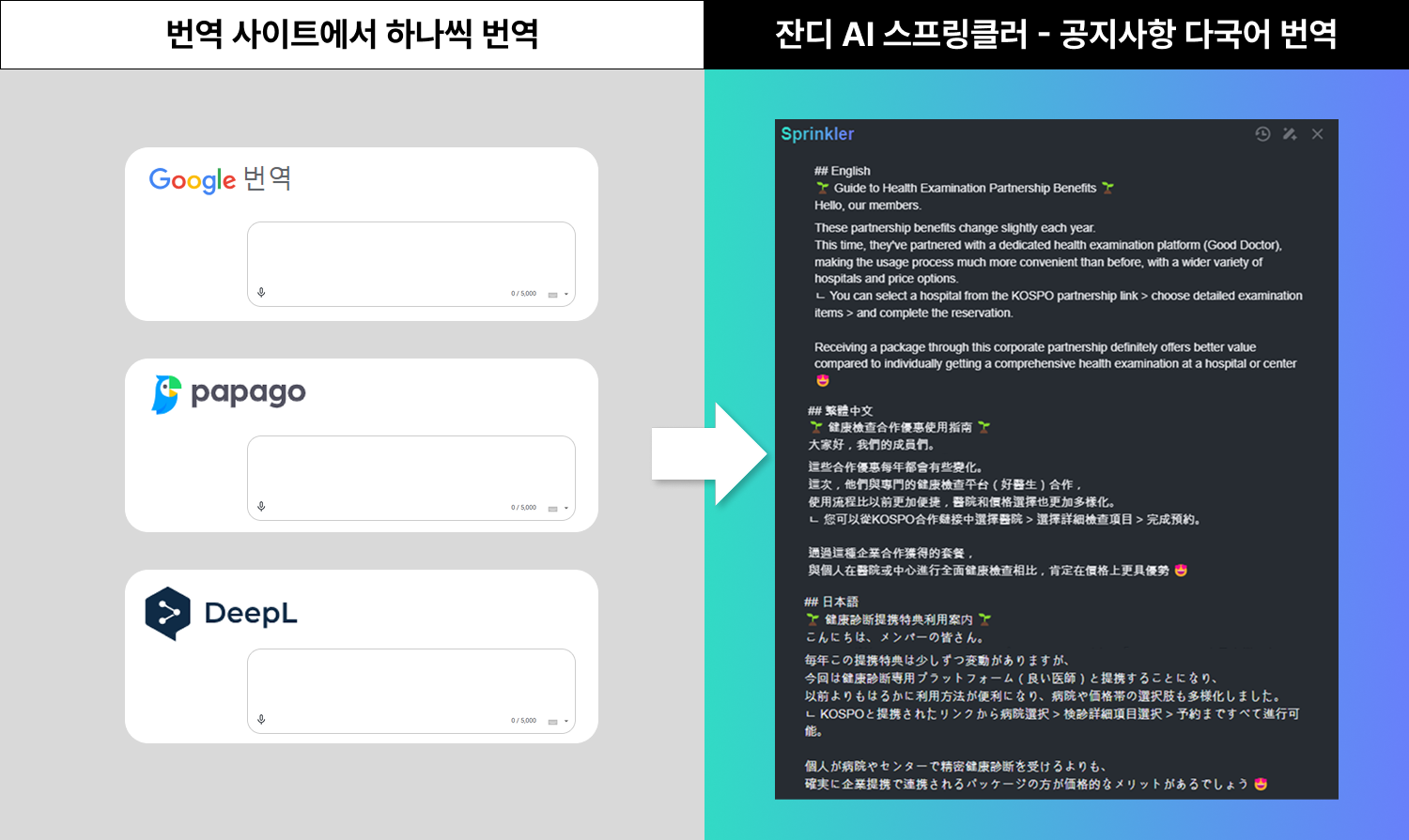 - 스프링클러 사용 전: HR팀은 공지사항을 해외 지사에 전달할 때마다 번거로운 번역 작업에 시간을 허비해야 했습니다. 기존에는 번역기를 통해 여러 언어를 동시에 번역하는 것이 불가능해 각 언어별로 별도의 번역 과정을 거쳐야 했죠.