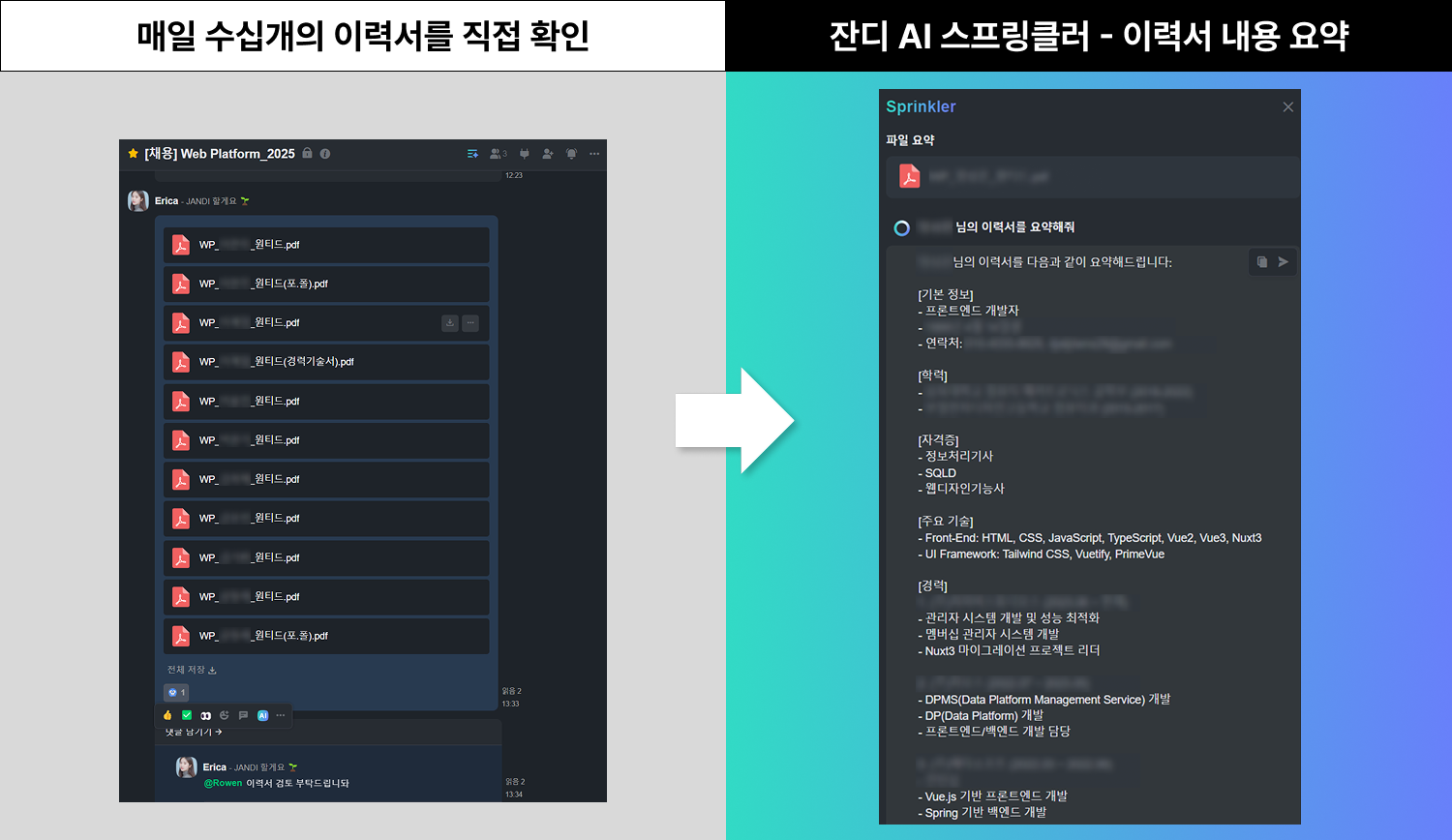 - 스프링클러 사용 후: [잔디 AI 스프링클러 – 파일 요약] 기능 덕분에 이력서 내 주요 내용을 1차로 간편하게 확인할 수 있게 되어 시간을 크게 절약할 수 있게 되었습니다!