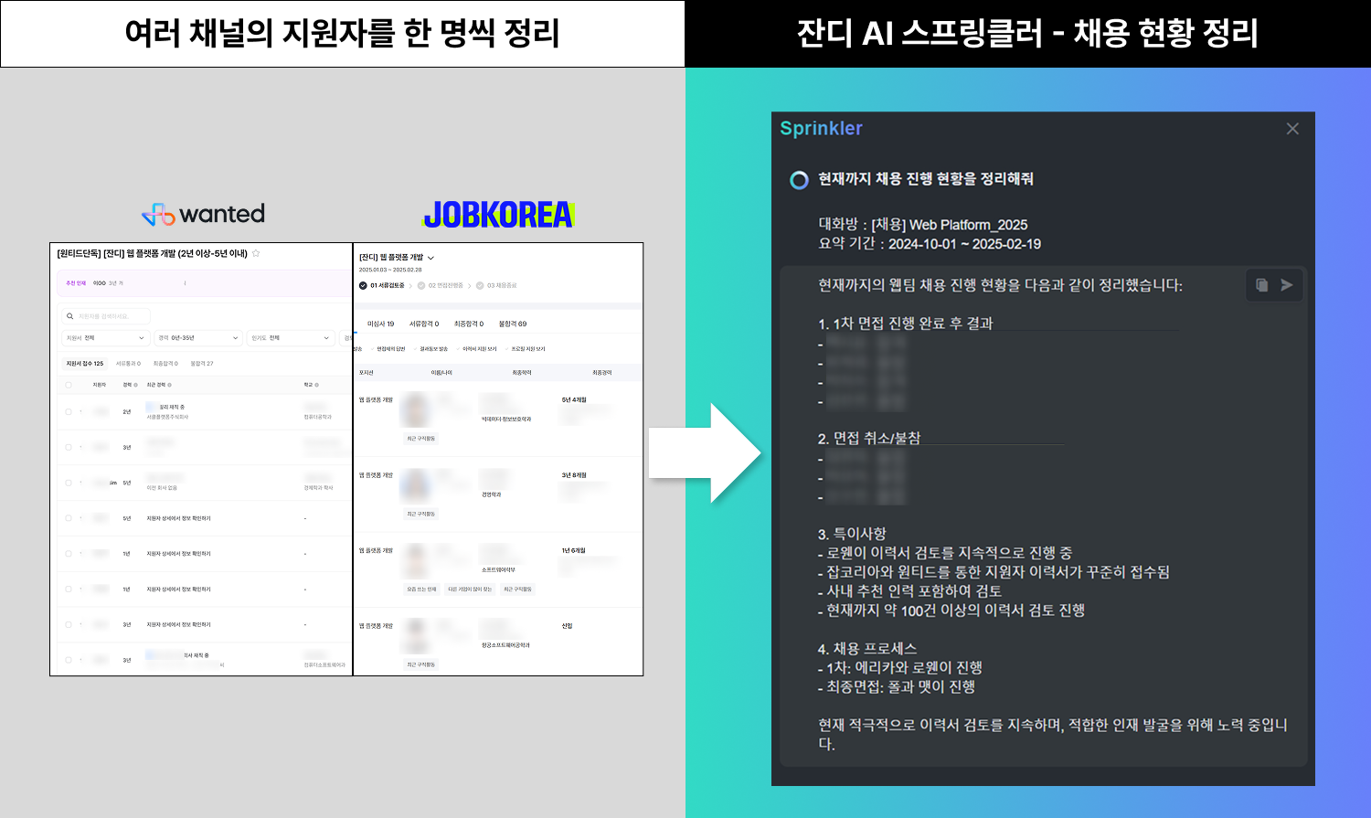 - 스프링클러 사용 후: [잔디 AI 스프링클러 – 대화방 요약] 기능을 활용하여 부서 별 채용 토픽의 내용을 한 번에 요약하고 보고할 수 있게 되었습니다!